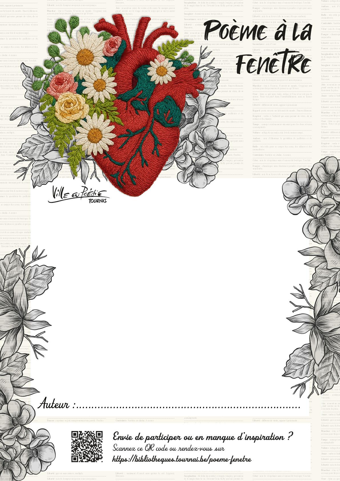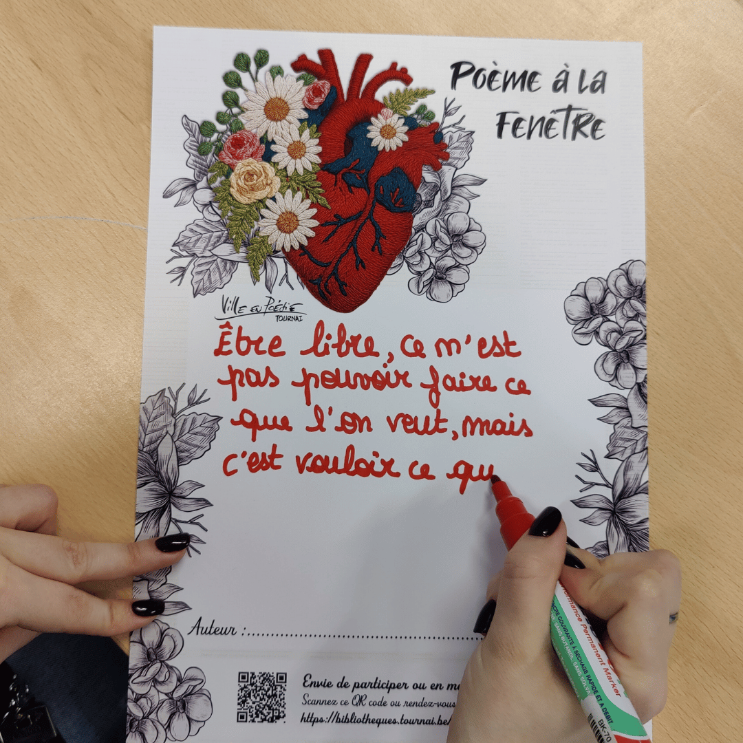 Dans le cadre du festival Tournai, Ville en Poésie, qui a lieu du 6 au 29 mars 2026, nous vous convions à participer à une expérience poétique et à partager votre amour des mots. Découvrez notre initiative créative : "Poème à la Fenêtre".